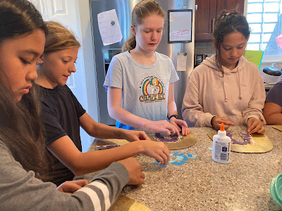 First, the girls made lip gloss. I don't think I took any pictures of the finished products, but it was very simple and easy. I ordered small containers on Amazon, bought a tub of petroleum jelly (Target brand) and several packets of unsweetened Kool-Aid mix. They used craft sticks to mix the contents together on a paper plate, and then transferred the lip gloss into the containers.